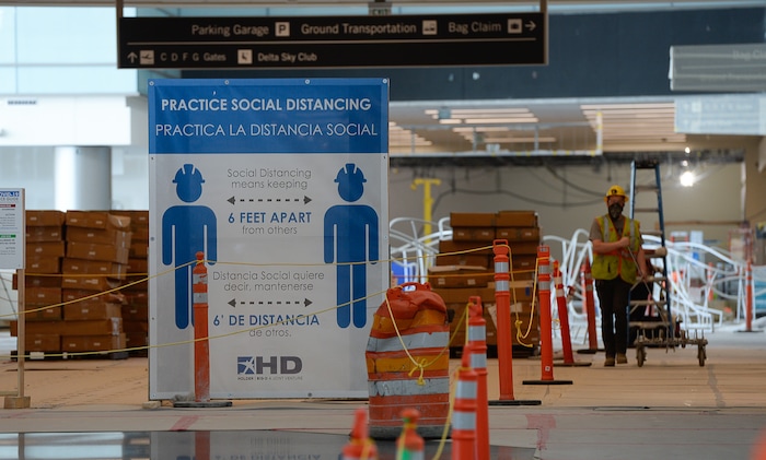 (Francisco Kjolseth | The Salt Lake Tribune) Signs encouraging social distancing are displayed due to the ongoing battle against COVID-19 as crews continue their work in the first phase of construction of the Salt Lake City International Airport on Wednesday, May 20, 2020.