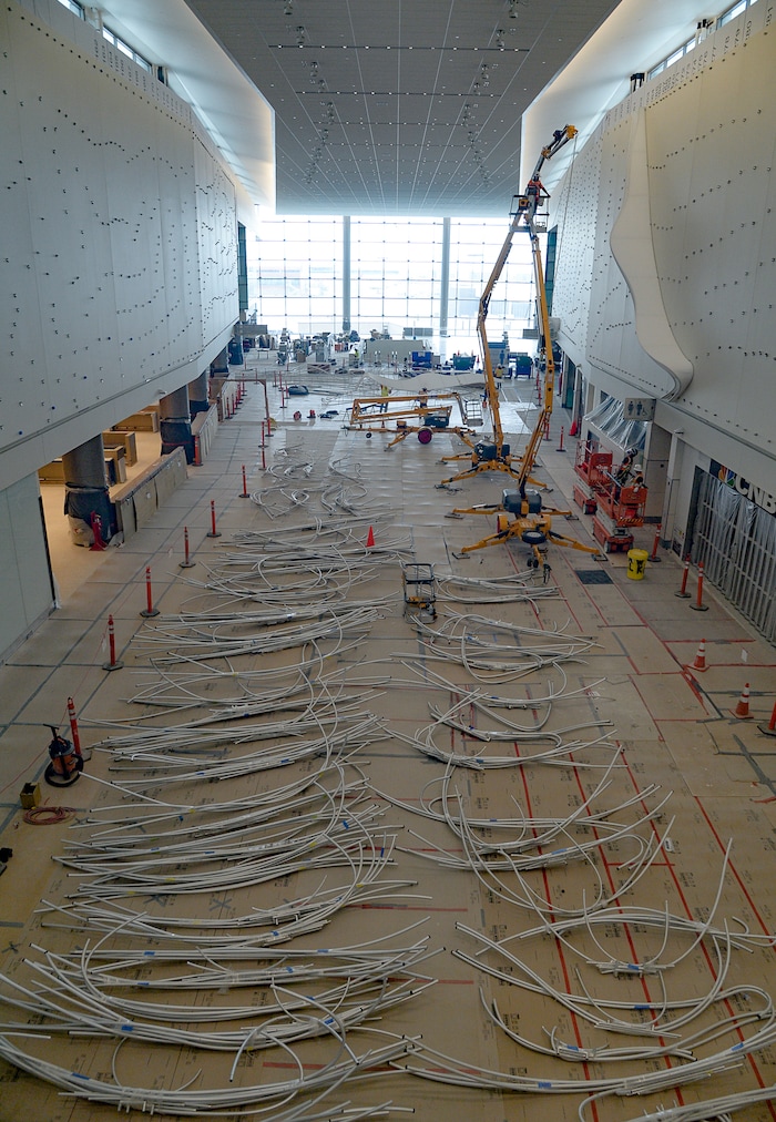 (Francisco Kjolseth | The Salt Lake Tribune) The area known as The Canyon begins to take shape with crews stretching fabric over metal fins to simulate southern Utah canyon walls as crews continue their work in the first phase of construction of the Salt Lake City International Airport on Wednesday, May 20, 2020.