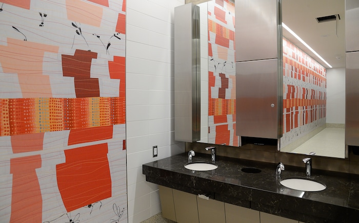 (Francisco Kjolseth | The Salt Lake Tribune) Quilt art by Nancy Bardach is replicated and installed on the wall in one of the bathrooms as crews continue their work in the first phase of construction of the Salt Lake City International Airport on Wednesday, May 20, 2020.