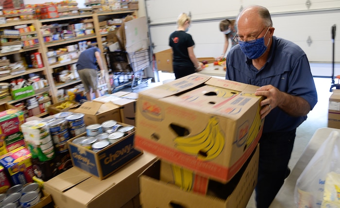 Bott adds that her food bank and the pantries it serves lost most of their volunteers when restrictions banned gatherings of more than 10 people — so church youth groups, among others, were forced to cancel their help.