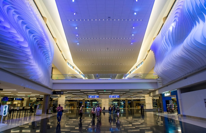 The mayor hailed the airport for being “beautiful, on time, on budget and for being built without a dollar of your taxes.” The bulk is being paid through passenger fees collected by airlines. She also praised it for having one of the most energy-efficient designs of any airport in the world.