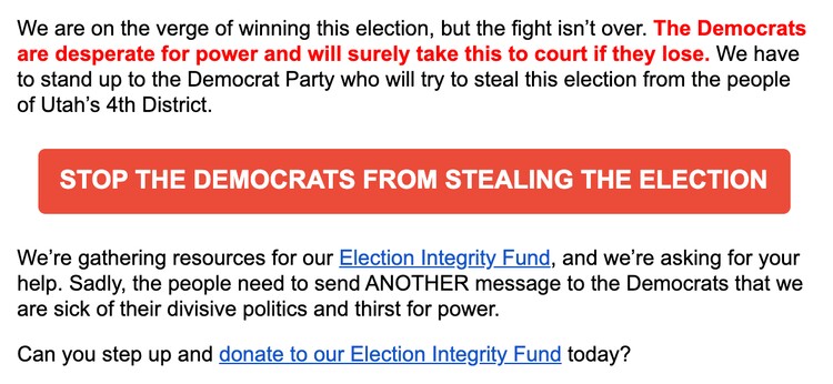 An email sent Wednesday made the explicit claim that Democrats were planning to “steal” the election in Utah’s 4th Congressional District, where Owens holds a 1,616-vote lead over Democrat Ben McAdams.
