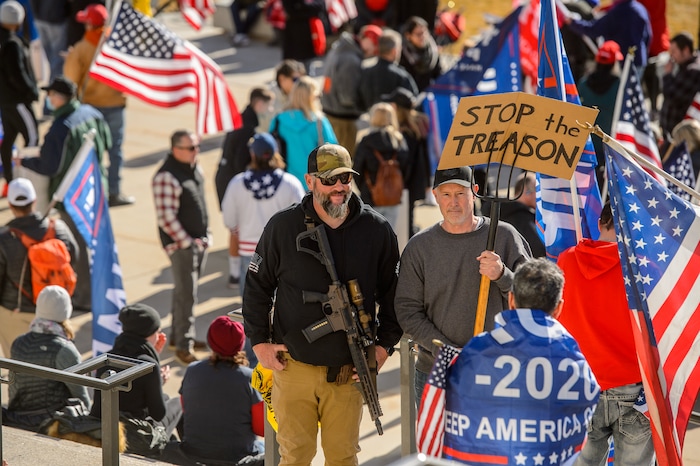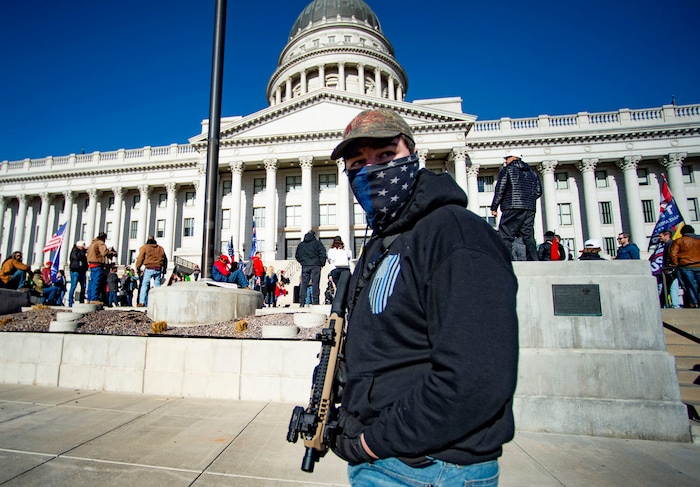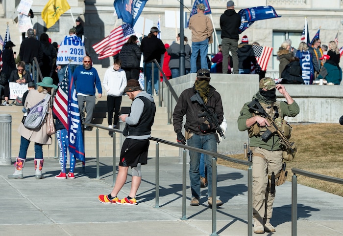 (Francisco Kjolseth | The Salt Lake Tribune) Heavily armed people walk amongst Trump supporters listening to speeches at the State Capitol in Salt Lake City on Wednesday, Jan. 6, 2021.
