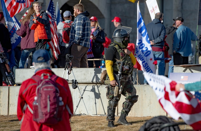 (Francisco Kjolseth | The Salt Lake Tribune) A heavily armed member of the Proud Boys, a far-right, neo-fascist organization walks amongst Trump supporters listening to speeches at the State Capitol in Salt Lake City on Wednesday, Jan. 6, 2021.