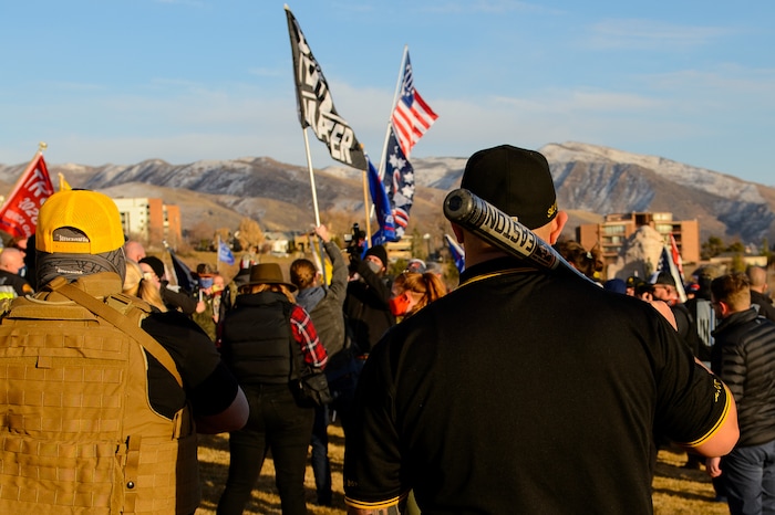 (Francisco Kjolseth | The Salt Lake Tribune) A member of the Proud Boys carries a bat as they pressure a small group carrying a Black Lives Matter Flag at a pro-Trump rally at the Utah State Capitol in Salt Lake City on Wednesday, Jan. 6, 2021.