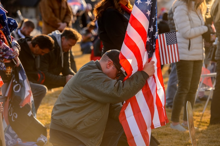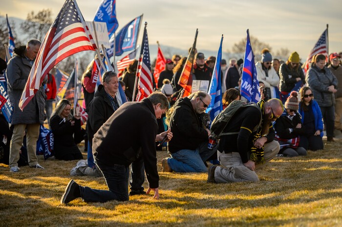 (Trent Nelson | The Salt Lake Tribune) Trump supporters kneel in prayer at the State Capitol in Salt Lake City on Wednesday, Jan. 6, 2021.