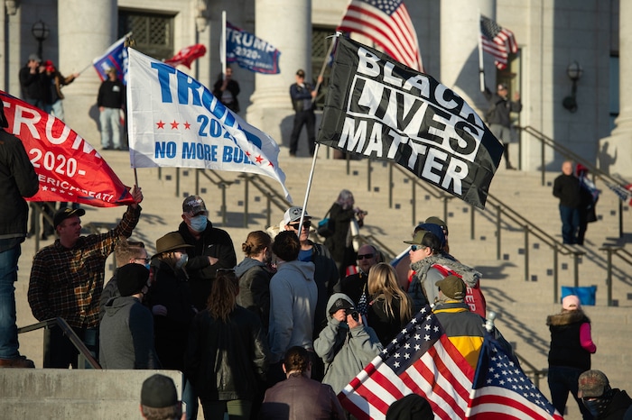 (Francisco Kjolseth | The Salt Lake Tribune) Trump supporters yell at a small group of people carrying a Black Lives Matter flag during a pro-Trump rally at the Utah State Capitol in Salt Lake City on Wednesday, Jan. 6, 2021.