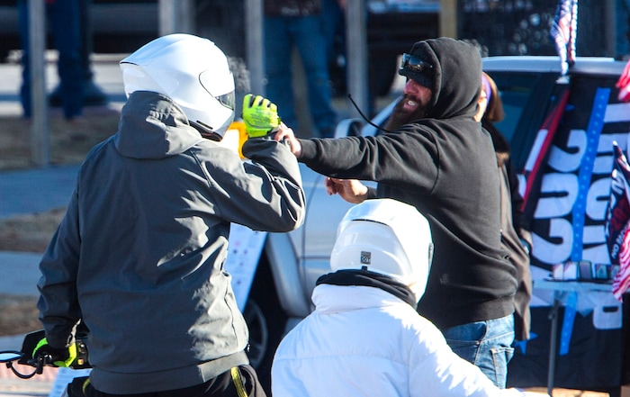 (Trent Nelson | The Salt Lake Tribune) An argument breaks out between members of the Proud Boys and people carrying a Black Lives Matter flag, as Trump supporters gathered at the State Capitol in Salt Lake City on Wednesday, Jan. 6, 2021.