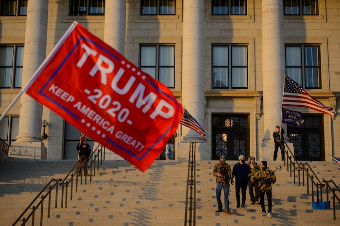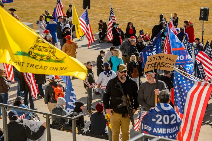 (Rick Egan | The Salt Lake Tribune). A small crowd of Trump protesters gather at the capitol with signs, flags and guns on Wednesday, Jan. 6, 2021.