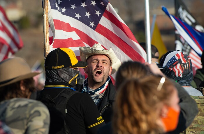 (Francisco Kjolseth | The Salt Lake Tribune) A small group of the extremist Boogaloos, argue with Proud Boys gathered for a pro-Trump rally at the Utah State Capitol in Salt Lake City on Wednesday, Jan. 6, 2021.