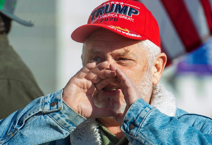 (Trent Nelson | The Salt Lake Tribune) A man calls for the hanging of "communist journalists" as Trump supporters gathered at the State Capitol in Salt Lake City on Wednesday, Jan. 6, 2021.