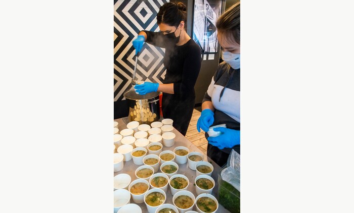 (Rick Egan | The Salt Lake Tribune) Jeanette Padilla and Lucie Sullivan dish up some organic, vegan soup for volunteers from the Food Justice Coalition to distribute to people experiencing homelessness, on Saturday, Feb. 27, 2021.