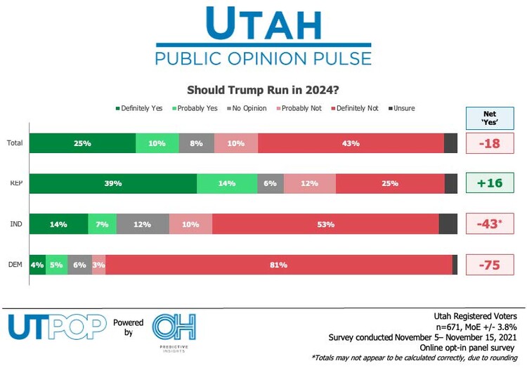 A new poll from OH Predictive Insights shows 35% of Beehive State voters say Trump should launch another campaign for president, but 53% say Trump should not run again.