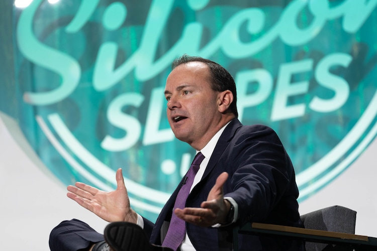 (Francisco Kjolseth | The Salt Lake Tribune) Utah Sen. Mike Lee takes on one of the questions asked by Apple CEO Tim Cook during a fireside chat at the Silicon Slopes Tech Summit in Salt Lake City on Wednesday, Oct. 13, 2021.