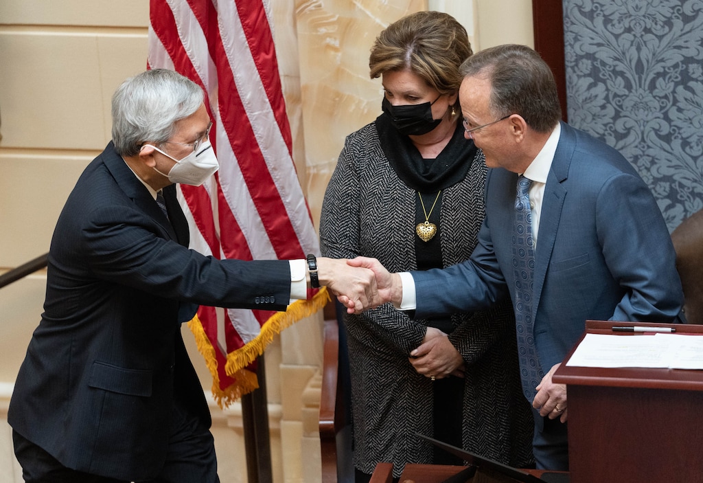 Adams was maskless when he opened the session Tuesday, including when he greeted Elder Gerrit W. Gong, one of the Twelve Apostles for The Church of Jesus Christ of Latter-day Saints, who offered an opening prayer. Adams wore a mask when he met with news media later in the day but was unmasked again when the Senate resumed business in the afternoon.