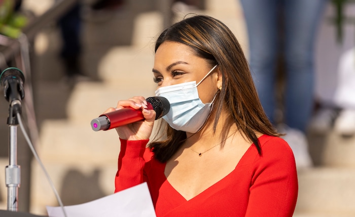 (Rick Egan | The Salt Lake Tribune) Participants gather on the steps of the Capitol, for the national Day Without Immigrants rally, on Monday, Feb. 14, 2022.
