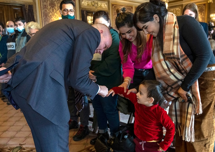 (Rick Egan | The Salt Lake Tribune) Gov. Spencer Cox meets with Afghan refugee sisters, Khatina and Kamila Emami, and 2-year-old Madina Nazari, in the gold Room at the State Capitol before a news conference for "Afghan Day on the Hill" on Wednesday, Feb. 23, 2022.
