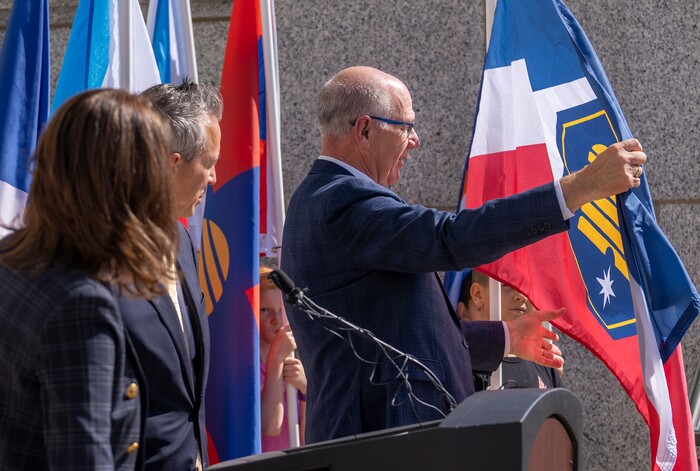 A new Utah state flag comes as a result of a 2021 bill sponsored by Sen. Dan McCay, R-Riverton, and Rep. Stephen Handy, R-Layton, which created a task force to explore the possibility of replacing the former flag. Both attended the display launch.