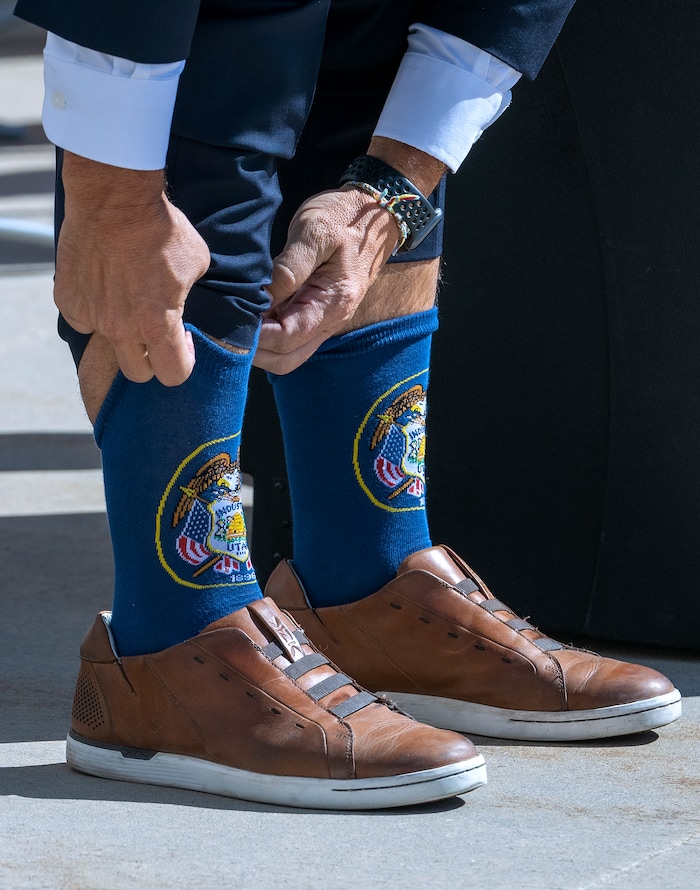 (Leah Hogsten | The Salt Lake Tribune) Sen. Daniel McCay, R-Riverton, a member of the the Utah State Flag Task Force, reveals his love for the current state flag by showing off his socks, Sept. 22, 2022 at the Utah Capitol. On Thursday, the Utah Department of Cultural & Community Engagement unfurled the 20 semifinal designs. The design review committee is seeking public feedback through a SurveyMonkey form until Oct. 5, 2022. After that time, four to six flags will be presented to the task force, led by Gov. Spencer Cox and Lt. Gov. Deidre Henderson. The final design will be presented to the Legislature later this fall.