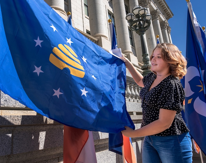 The 20 flags displayed at the statehouse were selected out of several thousand submissions, said Lt. Gov. Deidre Henderson, for the ways they represent the state’s culture, history and landscapes.