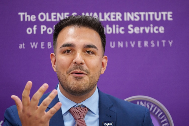 (Trent Nelson | The Salt Lake Tribune) Taylor Knuth speaks in the Ogden Mayoral Debate at Weber State on Thursday, Oct. 19, 2023.