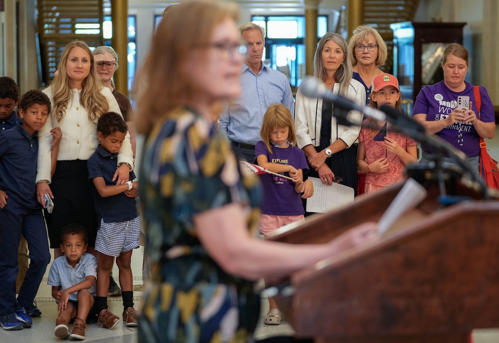 (Francisco Kjolseth | The Salt Lake Tribune) Katie Wright, Better Boundaries Executive Director, is joined by supporters as they gather at the Utah Capitol celebrate a Utah Supreme Court ruling that the Legislature overstepped its authority when it rewrote a 2018 voter-approved ballot initiative in drawing new congressional districts on Thursday, July 11, 2024.