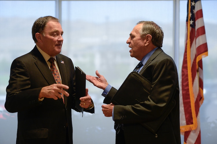 (Francisco Kjolseth | The Salt Lake Tribune) Gov. Gary R. Herbert, speaks with Commissioner of Higher Education Dave Buhler at Silicon Slopes in Lehi following a partnership announcement with IT companies and education to create a pathway program to fill workforce needs in the stateÕs tech industry.