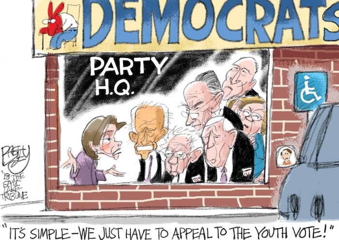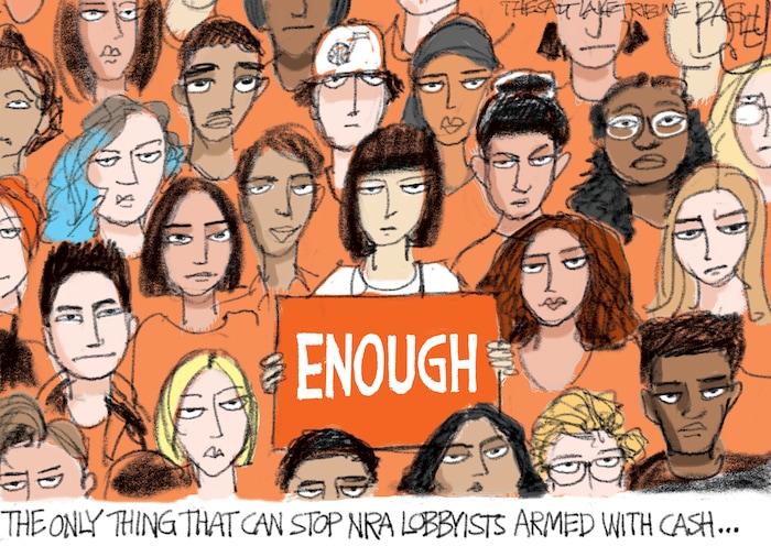 This Pat Bagley cartoon appears in The Salt Lake Tribune on Sunday, March 25, 2018.<br>You can check out the past 10 Bagley editorial cartoons below. <br>One Word – Plastics<br>Adoration of the Donald<br>Bloodsuckers<br>Killing Justice<br> A Tale of Two Moabs <br> Nesting Fib Face <br> The Kids Are Alright <br> Putin on Fifth Avenue <br>DeVos at the Wheel<br>Democratic Senior Discount<br>Want more Bagley? Become a fan on Facebook.