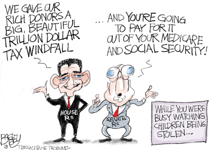 This Pat Bagley cartoon appears in The Salt Lake Tribune on Wednesday, July 4, 2018.<br>You can check out the past 10 Bagley editorial cartoons below:<br>Dog Days of Independence<br>A Murder of Crows<br>Violence Against Journalists<br>Trumping Justice<br>Uncivil War<br>Yours,Ours and Mines<br>Deficit Deceit<br>Caught!<br>A Mother’s Grief<br>Freedom Festival Follies<br>Want more Bagley? Become a fan on Facebook.