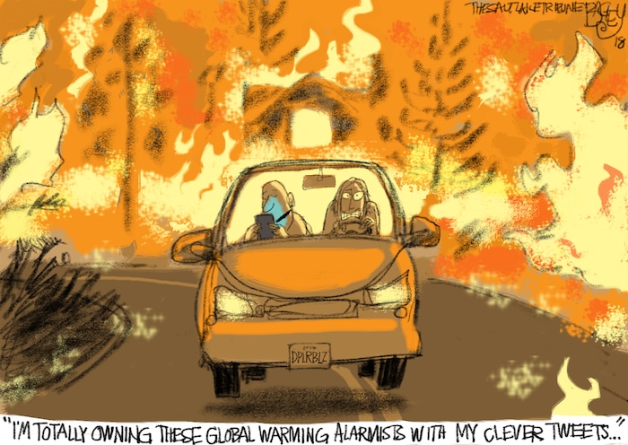 (Pat Bagley | The Salt Lake Tribune) This Pat Bagley cartoon titled "Climate Denial Hot Take" appears in The Salt Lake Tribune on Sunday, Nov. 11, 2018.