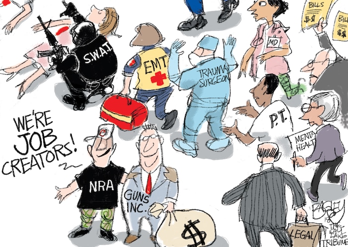 (Pat Bagley | The Salt Lake Tribune) This Pat Bagley cartoon called "Guns Create Jobs" appears in The Salt Lake Tribune on Wednesday, Nov. 14, 2018.