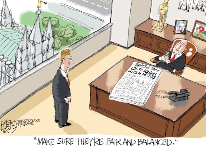 (Pat Bagley | The Salt Lake Tribune) This cartoon, titled "Churchy State," appears in The Salt Lake Tribune on Wednesday, May 15, 2019.