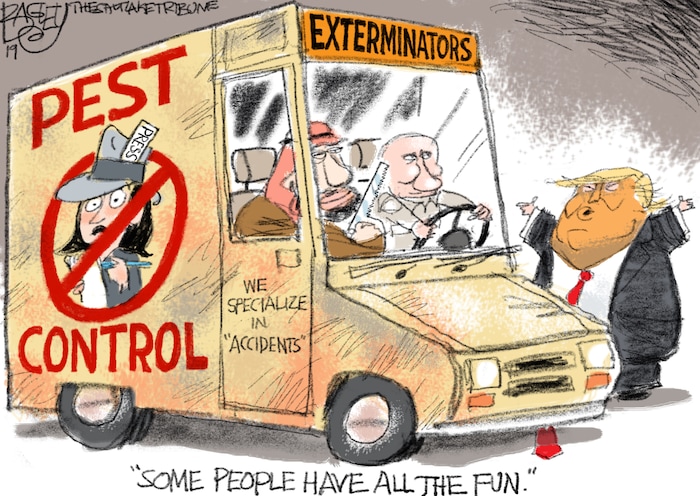 This Pat Bagley cartoon appears in The Salt Lake Tribune on Tuesday, July 16, 2019. You can check out the past 10 Bagley editorial cartoons below:
