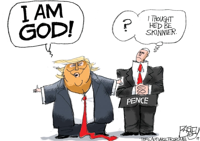 (Pat Bagley | The Salt Lake Tribune) This cartoon, titled “Grifting for God,” appears in The Salt Lake Tribune on Sunday, Sept. 1, 2019.
