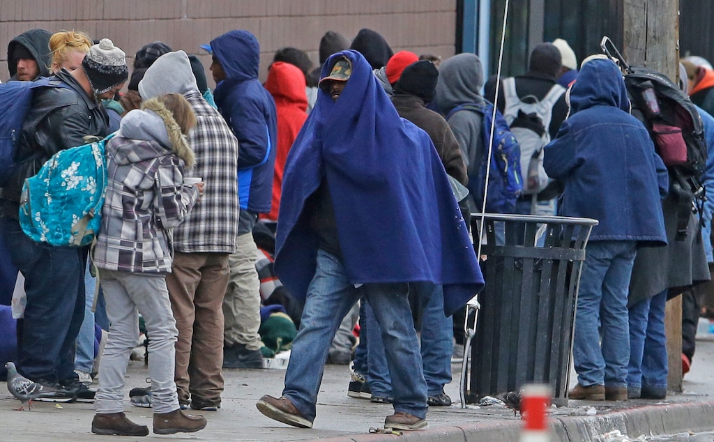 FILE - In this Feb. 24, 2017, file photo, people gather near a shelter in Salt Lake City. Utah state officials gather a ton of data about the homeless population, but none of it helps evaluate the effectiveness of different programs because it's riddled with inconsistencies and lacks clear, measurable goals, the stated auditor found in a new report. (AP Photo/Rick Bowmer, File )