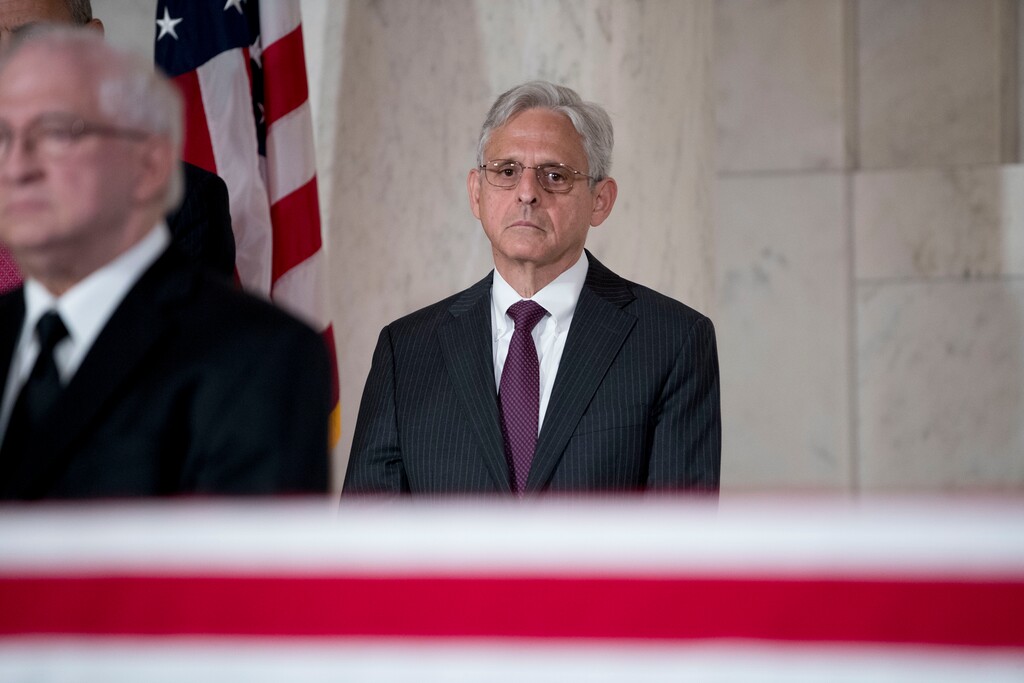 (Andrew Harnik | AP) Former President Barack Obama's Supreme Court nominee Merrick Garland pays his respects for the late Supreme Court Justice John Paul Stevens as he lies in repose in the Great Hall of the Supreme Court in Washington, Monday, July 22, 2019.