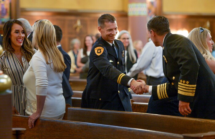 Leah Hogsten | The Salt Lake Tribune l-r Legal assistants Maria Montoya and Myrleen Wright greet as Salt Lake City Police Department Captain Lance VanDongen shakes the hand of Salt Lake City Fire Department Assistant Chief Michael Fox during The Feast of the Exaltation of the Holy Cross Red Mass, Friday, Sept. 14, 2018 at Cathedral of the Madeleine to recognize and honor first responders, members of the military and the legal professions for their service to the community.