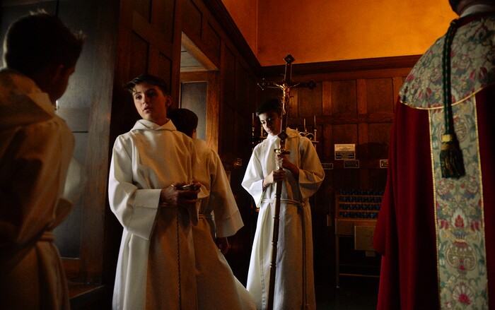 Leah Hogsten | The Salt Lake Tribune Cathedral of the Madeleine altar boys prepare for The Feast of the Exaltation of the Holy Cross Red Mass, Friday, Sept. 14, 2018 at Cathedral of the Madeleine to recognize and honor first responders, members of the military and the legal professions for their service to the community.