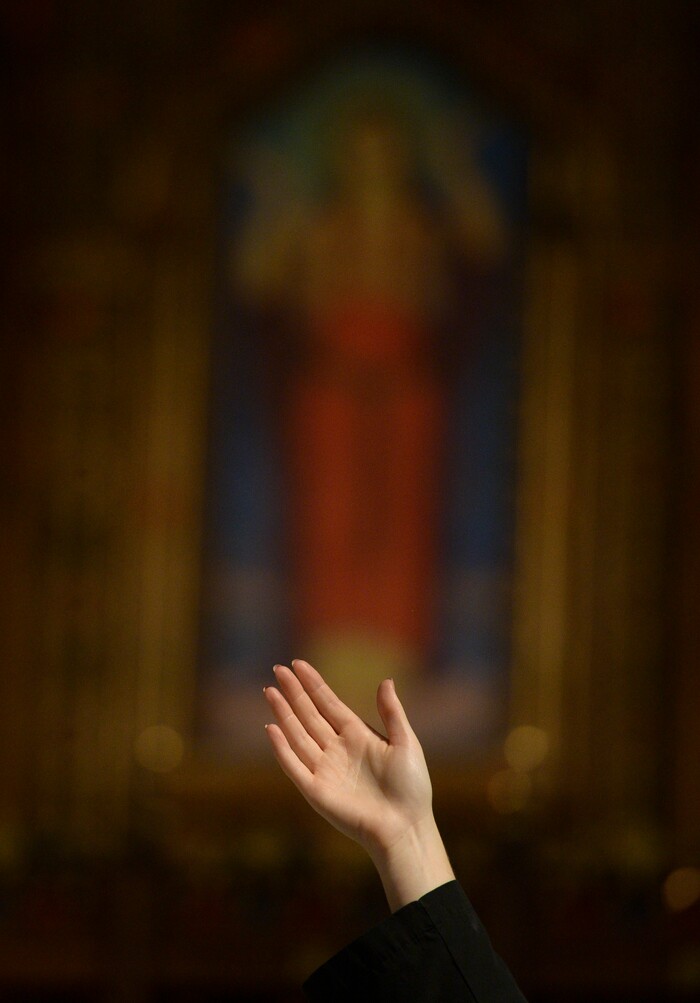 Leah Hogsten | The Salt Lake Tribune Cantor Clarisse Colao raises her hand during The Feast of the Exaltation of the Holy Cross Red Mass, Friday, Sept. 14, 2018 at Cathedral of the Madeleine to signal to the congregation to join in song. The ceremony recognized and honored first responders, members of the military and the legal professions for their service to the community.