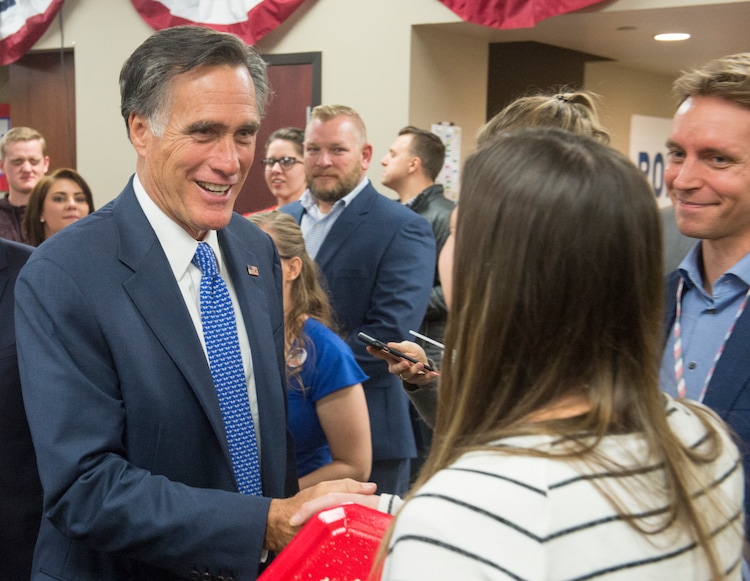 (Rick Egan | The Salt Lake Tribune) Mitt Romney shakes hands with supporters at Romney Headquarters in Orem on election night, Tuesday, Nov. 6, 2018.