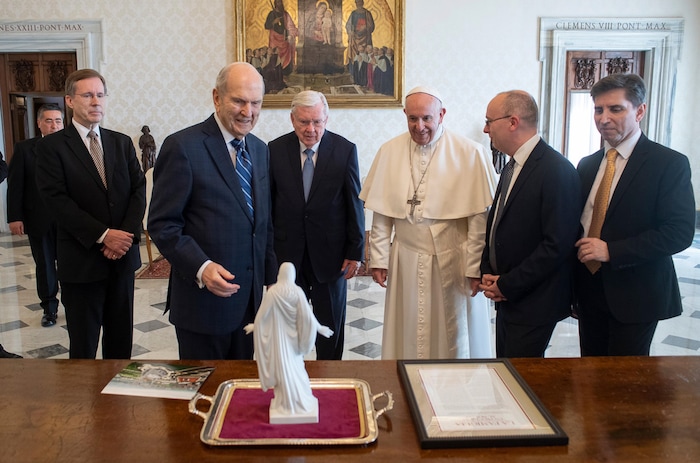 (Photo courtesy of the Vatican) Latter-day Saints President Russell M. Nelson gave Pope Francis a Christus statue and a framed Proclamation on the Family in Italian during their historic meeting at the Vatican on Saturday, March 9, 2019.