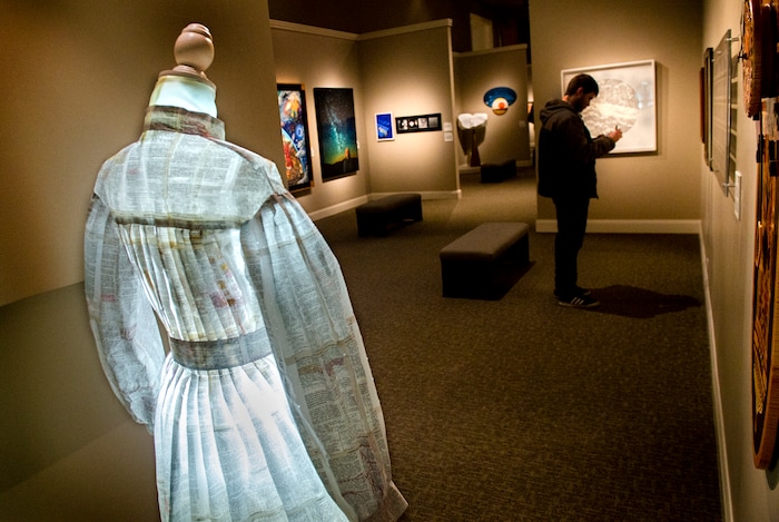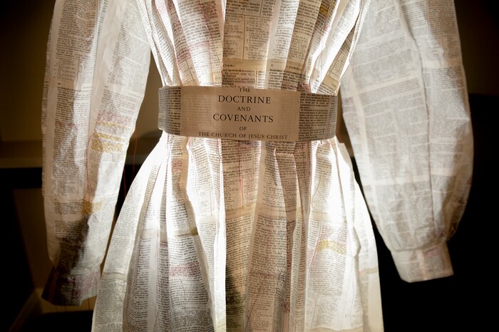 Leah Hogsten | The Salt Lake Tribune "The project bean with my childhood set of scriptures, which after years of use, were falling apart," said Danielle Hatch of her Doctrine and Covenants dress titled "And I Am Here" sculpture, paper and wooden armature. The 11th International Art Competition: Meditations on Belief at the Church History Museum runs until October 7, 2019. The 151 selected works exhibition was drawn from over 900 submissions from countries around the world, in a variety of media, from woodcut to photography and from sculpture to textile.