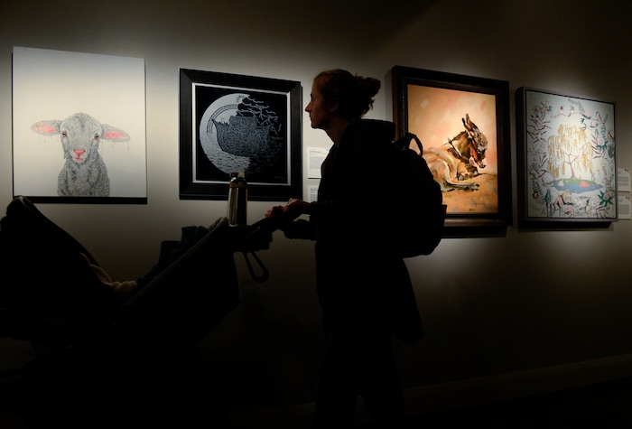 Leah Hogsten | The Salt Lake Tribune Artist Sarah Winegar of Salt Lake City, who's relief printing was on display, pushes her sleeping son Luca, 3 months in a stroller while looking at the other works of art. The 11th International Art Competition: Meditations on Belief at the Church History Museum runs until October 7, 2019. The 151 selected works exhibition was drawn from over 900 submissions from countries around the world, in a variety of media, from woodcut to photography and from sculpture to textile.