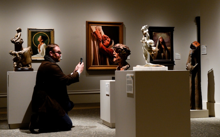 Leah Hogsten | The Salt Lake Tribune Zion Art Society podcaster Dr. Micah Christensen takes pictures of the 11th International Art Competition: Meditations on Belief at the Church History Museum on Tuesday. The show runs until October 7, 2019. The 151 selected works exhibition was drawn from over 900 submissions from countries around the world, in a variety of media, from woodcut to photography and from sculpture to textile.