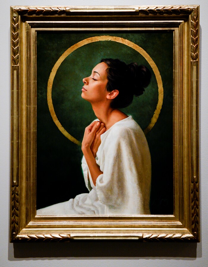 Leah Hogsten | The Salt Lake Tribune Natalie Hunsaker's oil on panel titled "Awake, Awake...Put On Thy Beautiful Garments" on display at the 11th International Art Competition: Meditations on Belief show at the Church History Museum on Tuesday. The show runs until October 7, 2019. The 151 selected works exhibition was drawn from over 900 submissions from countries around the world, in a variety of media, from woodcut to photography and from sculpture to textile.