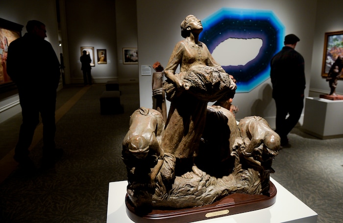 Leah Hogsten | The Salt Lake Tribune Visitors to the Church History Museum look at the works of art including the sculpture by Annette Everett titled "Gratitude," inspired by Jules Breton's painting Song of the Lark, during the 11th International Art Competition: Meditations on Belief at the Church History Museum on Tuesday. The show runs until October 7, 2019. The 151 selected works exhibition was drawn from over 900 submissions from countries around the world, in a variety of media, from woodcut to photography and from sculpture to textile.