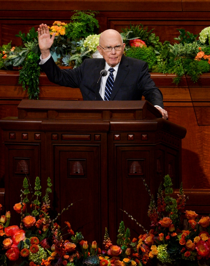 (Leah Hogsten | The Salt Lake Tribune) President Henry B. Eyring addresses church members during 189th Annual General Conference of The Church of Jesus Christ of Latter-day Saints, April 6, 2019, in Salt Lake City.