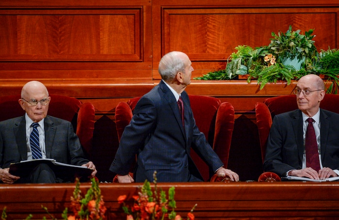 (Leah Hogsten | The Salt Lake Tribune) President Russell M. Nelson, center, reaches out to squeeze the hand of President Dallin H. Oaks, left, during the morning session of the189th Annual General Conference of The Church of Jesus Christ of Latter-day Saints in Salt Lake City. President Henry B. Eyring is at right.