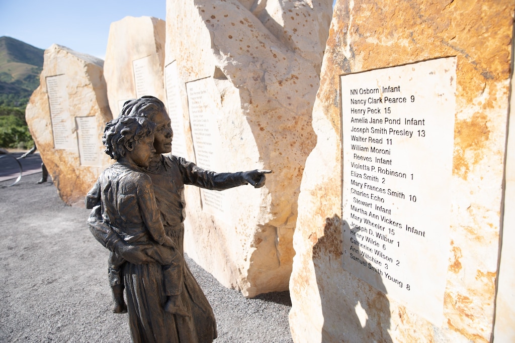 The youngsters’ names are etched in 17 large stones at This Is the Place Heritage Park on Salt Lake City’s east bench, accompanied by 47 bronze statues that detail many of their stories.