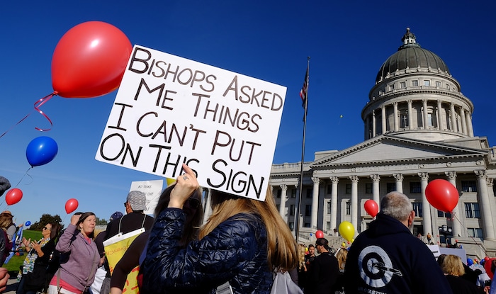 Many at the rally also were focused on those interviews with signs saying, “No sexual questions,” “Ex-Mormons assemble” and “LDS Church, improve your institution.”